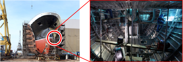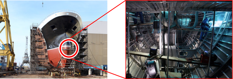 In the production of a large steel ship in Japan, the welding of the bilge using semi-automatic torches