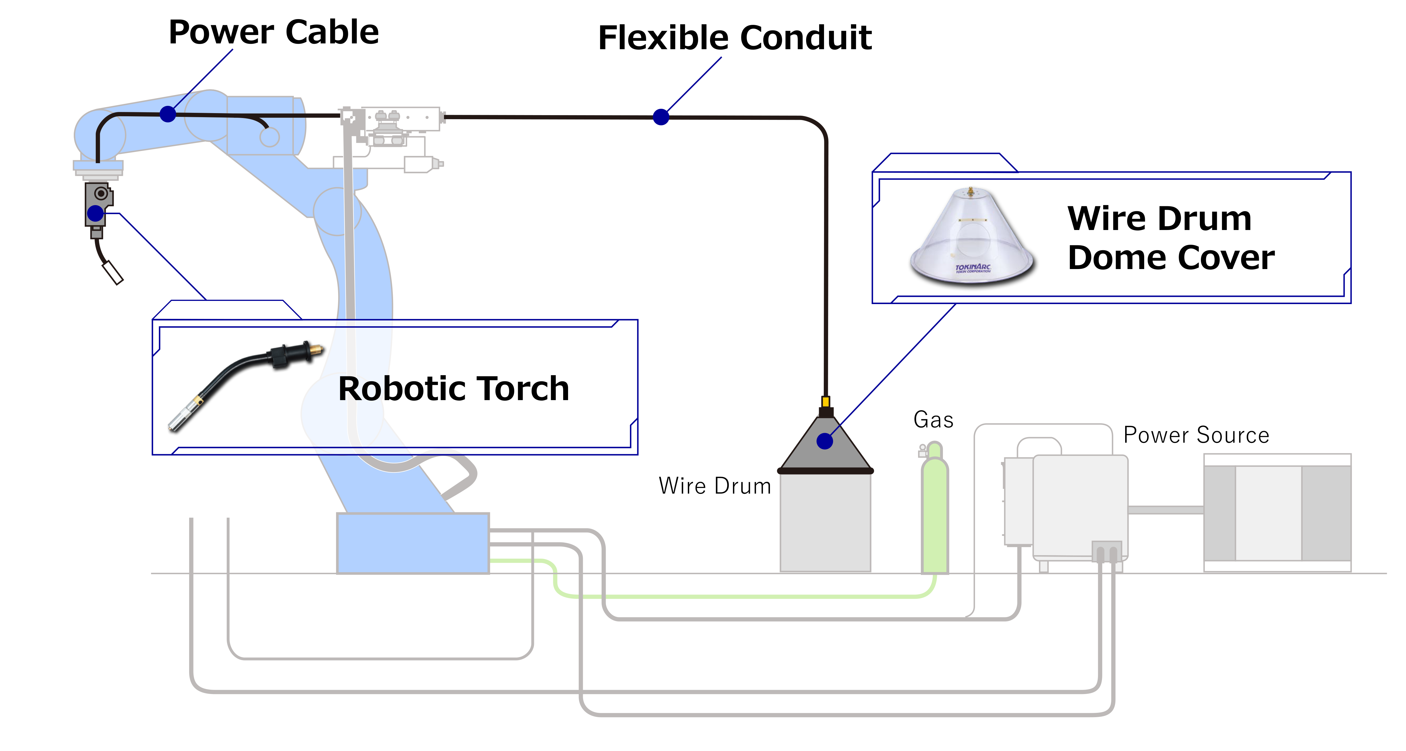 The standard composition of an industrial arc welding robot system is illustrated in the above drawing.